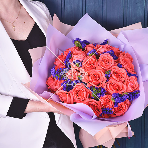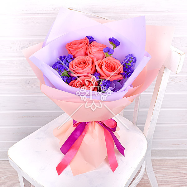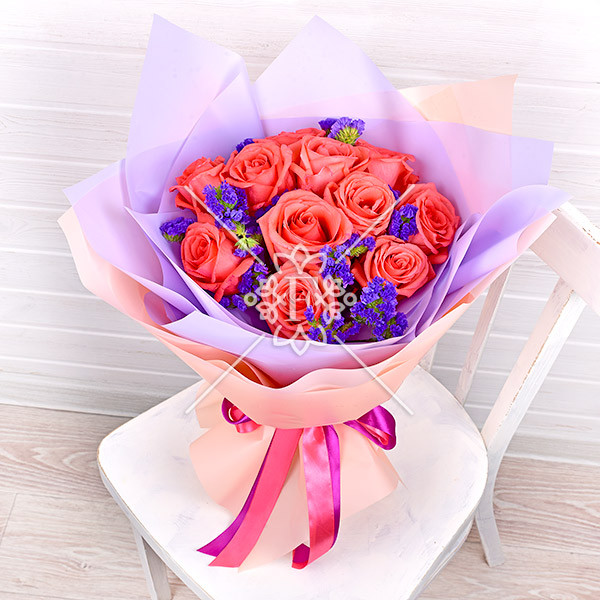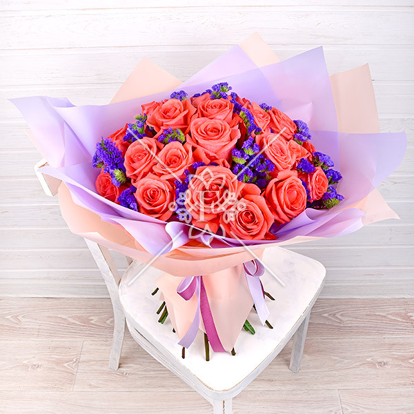 Королева цветов – роза, представлена здесь в кораллово-оранжевом цвете, и выражает самые наилучшие пожелания, энтузиазм и радость. Нежные цветы фиолетовой статицы  прекрасно сочетаются с розами, и обещают успех во всех начинаниях! Фиолетовый и оранжевый цвета выглядят очень ярко и гармонично.